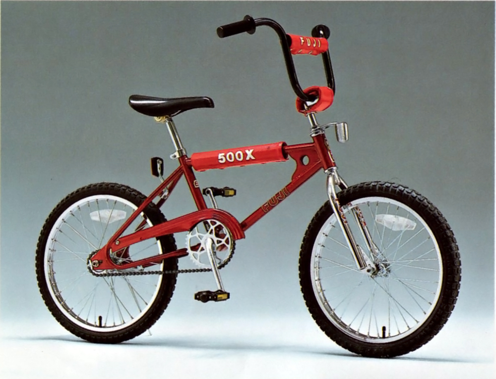 In 1983 Fuji changed the look of the MX-500 and began calling it the 500x. The 500x was available from 1983 to 1985. The specifications remained largely the same. Noticable differences are the frame decals, labeled frame bar pads and a change from round to square/rectangular reflectors. In 1984 and 1985 they changed from a vynil padded seat to a plastic seat and in the catalog pictures the tires almost appear to be a fat skinny 1.75x2.125 combo.